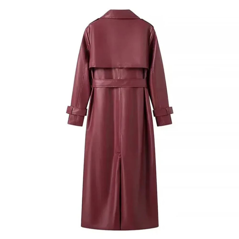 The Marget Leather Belted Coat blends structure and confidence in one clean silhouette. Designed from smooth vegan leather, it features a belted waist that defines shape while maintaining a bold, minimal edge.
